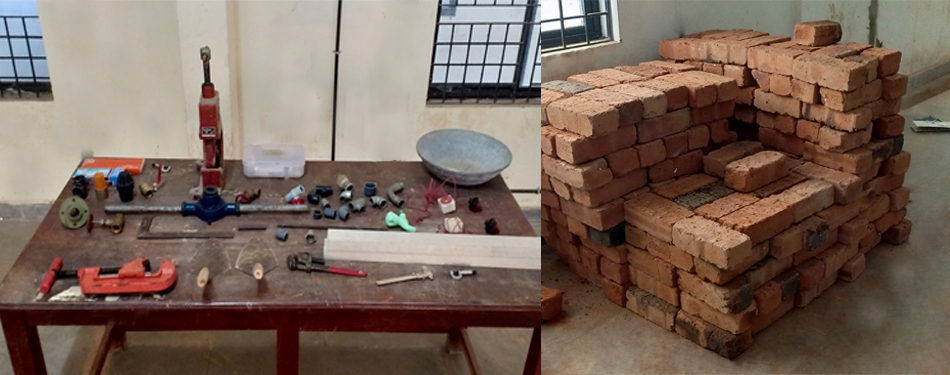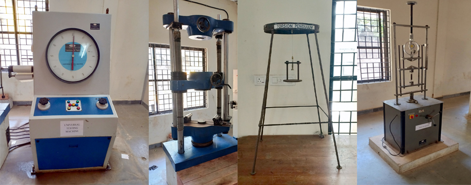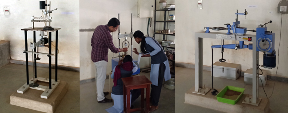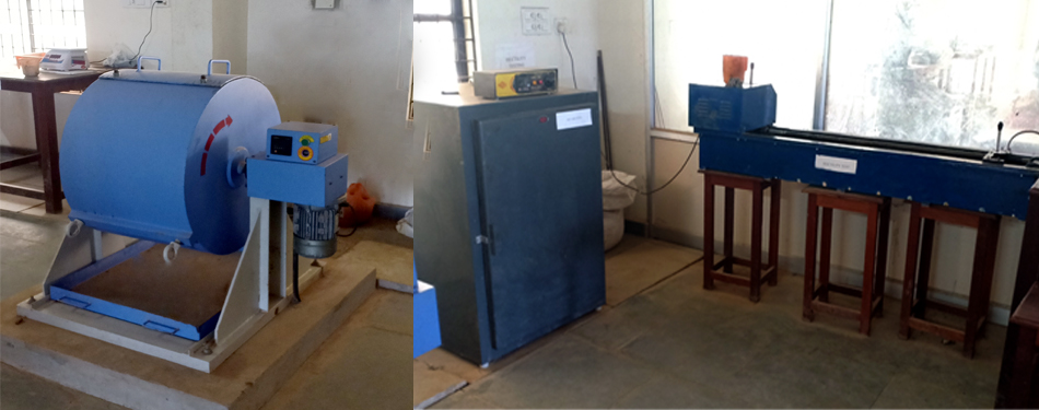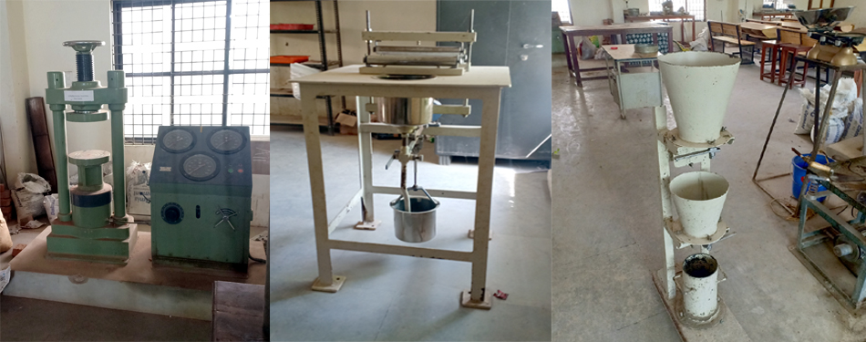 The major equipments used are Compression testing machine, Tile testing machine, Impact testing machine, Crushing strength testing machine, Los Angeles apparatus, Flow table, Compaction factor apparatus, Slump cone, Concrete mixer, Vicat apparatus, Air permeability apparatus, Rebound hammer etc. The major experiments conducted are Tests on cement, Tests on aggregates, Tests on fresh concrete, Tests on hardened concrete, Tests on bricks & Tiles.
